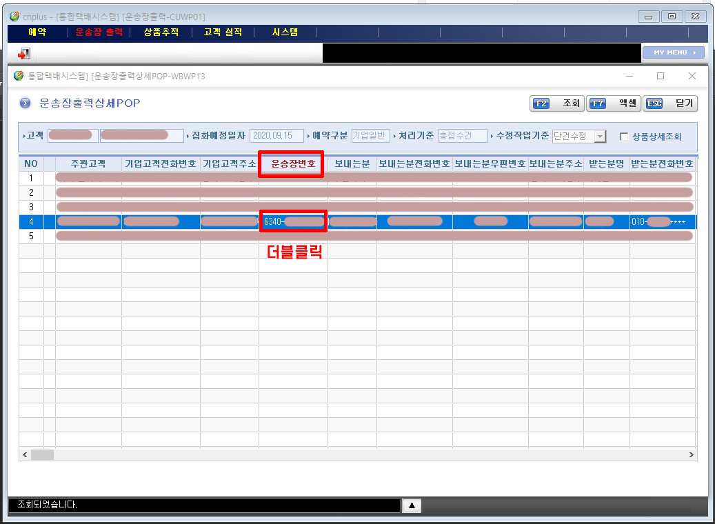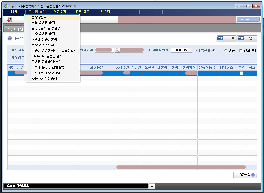 운송장 출력 메뉴의 '운송장 출력' 클릭