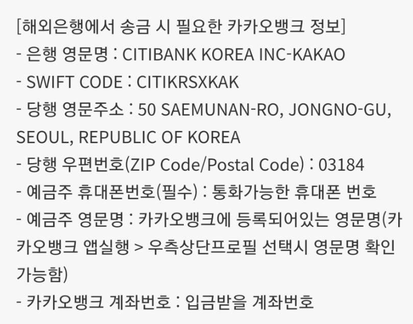 은행별 외화송금 수수료 비교하기 2023.03.21 - [온라인정보] - 블로그수익 애드포스트 외화통장 수수료비교 은행연합회 소비자포털 해외 송금용 통장을 일단 만들고 하려다가 제일 간단한 방법인 외화통장 없이 송금 받는 카카오뱅크를 이용하기로 했다. Google AdSense 접속 - 메인 메뉴 좌측 하단 [지급] - [결제 정보]를 누르면 위의 사진처럼 결제 정보 화면이 보인다. 우측의 결제 수단 추가 버튼 클릭. 결제 수단 추가 - 새 은행 송금 세부정보 추가 클릭 선택사항은 제외하고 필수 정보 입력하면 등록 완료. 예금주 이름, 은행, 식별코드 등은 영문 입력하기. 카카오뱅크 영문 이름 : CITIBANK KOREA INC - KAKAO 카카오뱅크 swift 은행 식별 코드 (BIC) : CITI..